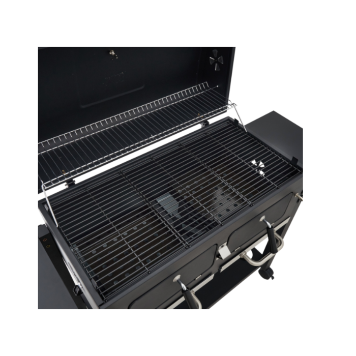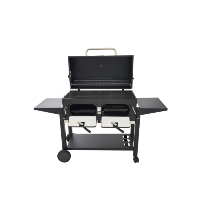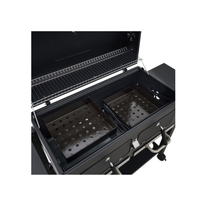 Grâce à ses deux zones de cuisson séparées, vous pouvez cuire simultanément des aliments à des températures différentes — idéal pour gérer viandes, légumes ou poissons en un seul service. Robuste, fonctionnel et élégant, ce barbecue au charbon est le compagnon rêvé des grandes occasions.