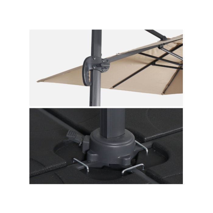 Sa structure déportée libère l’espace sous la toile, tandis que le système d’inclinaison et de rotation 360° permet de suivre la course du soleil à tout moment de la journée. Livré avec ses 4 dalles à lester 50 x 50 cm, il vous assure une stabilité optimale dès l’installation, sans achat complémentaire.